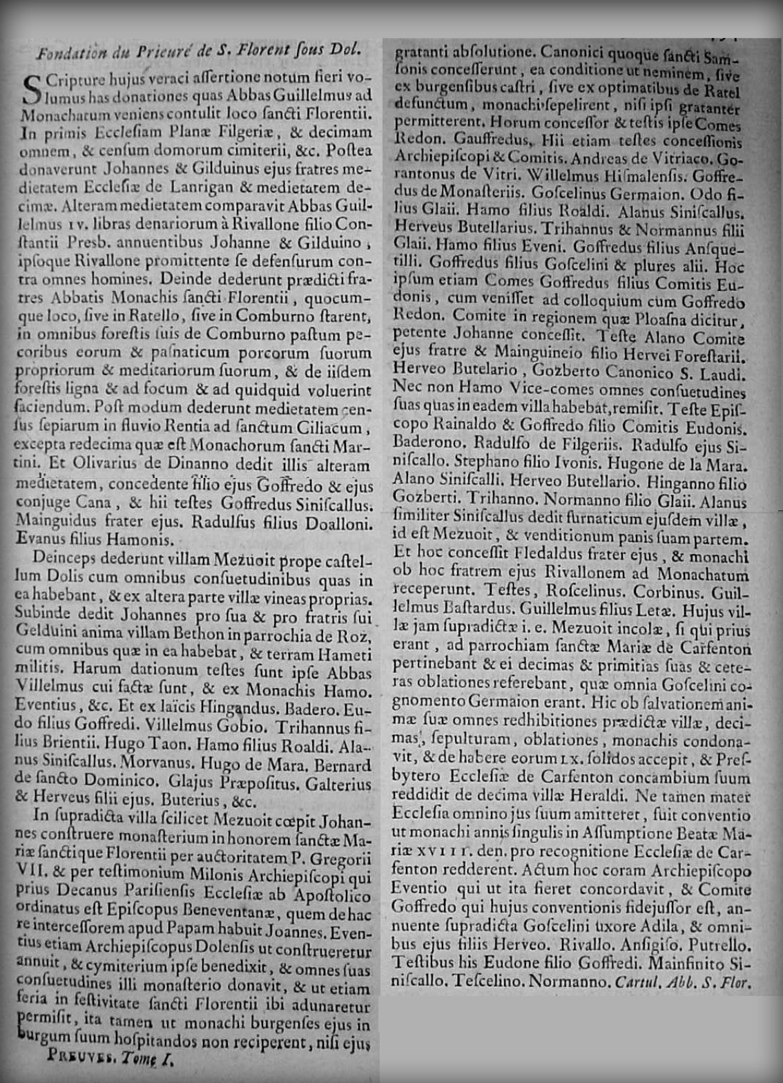 Scripture hujus veraci assertione notum fieri volumus has donationes quas Abbe Guillelmus ad monachatum veniens contulit loco Sancti Florenti. In primis Ecclesiam Planae Filgeriae, et decimam omnem et censum domorum cimeterii etc. Postea donaverunt Johannes et Gilduinus ejus fratres medietatem ecclesiae de Lanrigan et mediatem deciame. Alteram medietatem comparavit Abbas Guillelmus IV libras denariorum a Rivallone filio filio Constantii Presb. annuentibus Johannes et Gilduino, ipso que Riwallone promittente se defenserum contra omnes homines. Deinde dederunt praedicti fratres Abbatis monachis Sancti Florentii quocumque loco sive en Ratello, sive in Comburno starent in omnibus forestis suis de Comburno pastum pecoribus et pasnaticum porcorum suorum proprium et meditariorum suorum et ejusdem forestii ligna et ad focum et ad quidquid voluerint faciendum. Post modum dederunt medietatem census sepiarum in fluvio Rencia ad Sanctum Ciliacum excepta redecima quae est monachorum Sancti Martini. Et Olivarius de Dinnano dedit illis alteram mediatem, concedente filio ejus Goffredo et ejus conjuge Cana. Et hiis testes Goffredus senescallus; Mainguidis frater ejus; Radulfus filius Doalloni; Evanus filius Hamonis. Deinceps dederunt villam Mezuoit prope castellum Dolis cum omnibus consuetudinibus quas in ea habebant et ex altera parte villae vineas proprias. Subinde dedit Johannes pro sua et pro fratris sui. Gelduini anima villam Bethon in parrochia de Roz cum omnibus quae in ea habebat, et terram Hameti militis.Harum dationum testes sunt ipse Abbas Villelmus cui factae sunt; ex Monachis Hamo; Eventius etc. et ex laïcis Hingandus, Baderon, Eudos filius Goffredi, Villelmus Gobio, Trihannus filius Brientii, Hugo Taon, Hamo filius Roaldi, Alanuis siniscallus, Morvanus, Hugo de Mara, Bernard de Sancto Dominico, Glajus Praepositus, Galterius et Herveus filii ejus, Buterius etc. In supradicta villa scilicet Mazuoit coepit Johannes construere monastorium in honorem Santae Mariae Sanctique Flrentii per auctoritatem P.Gregorii VII. et per testimonium Milonis archiepiscopi qui prius Decanus Parisiensis Ecclesiae ab Apostolico ordinatus est Episcopus Beneventanae [evêque du Bénévent] , quem de hac re intercessor apud Papam habuit Joannes . Eventium etiam Archiepiscopus Dolensis ut construeretur annuity, et cymiterium ipse benedixit et omnes sua consuetudines illi monasterio donavit; et ut etiam feria in festivitate sancti Florentii ibi adunaretur permisit, ita tamen ut monachi burgense ejus in burgum suum hospitandos non reciperent, nisi ejus gratanter absolutione. Canonici quoque Sancti Samsonis concesserunt ea conditione ut neminen, sive ex burgensibus castri, sive ex optimatibus de Ratel defunctum, monachi sepelirent, nisi ipsi gratanter permitterent. Horum concessor et testi ipse Comes Redonis Gauffredus; Hii étiam testes et concessionis : Comitis Andreas de Vitriaco; Gorantonus de Vitri; Willelmus Hismalensis; Goffredus de Monasterii; Goscelinus Germaion; Odo filius Glaii; Hamo filius Roaldi; Alanus sénescallus; Herveus Butellarius; Trihannus et Normannus filii Glaii; Hamo fils Evenis; Goffredus filius Ansquetilli; Goffredus filius Goscelini et plures alii. Hoc ipsum etiam Goffredus filius comitis Eudonis, cum venisset ad colloquium cum Goffredo Rodon. comite in regionem quae Ploasna dicitur petente Johanne concessit. Teste Alamo Comite ejus fratre et Mainguineio filio Herveii Forestarii; Herveo Butelario; Gozberto Canonici Sancto Laudi; Nec non Hamo Vice-comes omnes consuetudines suas quas in eadem villa habebat, remisit. Testes episcopo Rainaldo et Goffredo filius Comitis Eudonis; Balderono; Radulfo de de Filgeriis; Radulfo ejus senescallo; Stephano filio Ivonis; Hugone de la Mara; Alano Siniscalli; Herveo Butellario; Hinganno filio Gozberti; Trihanno; Normanos filio Glaii; Alanus similiter siniscallus dedit furnaticum ejusdem villae id est Mezoit; et venditionum panis suam partem. Et hoc concessit Fladaldus fratre ejus. Et monachi ob hoc fratrem ejus Riwallonem ad monachatum receperunt. Testes : Roscelinus; Corbinus; Guillelmus Bastardus; Guillelmus filius Letae;.