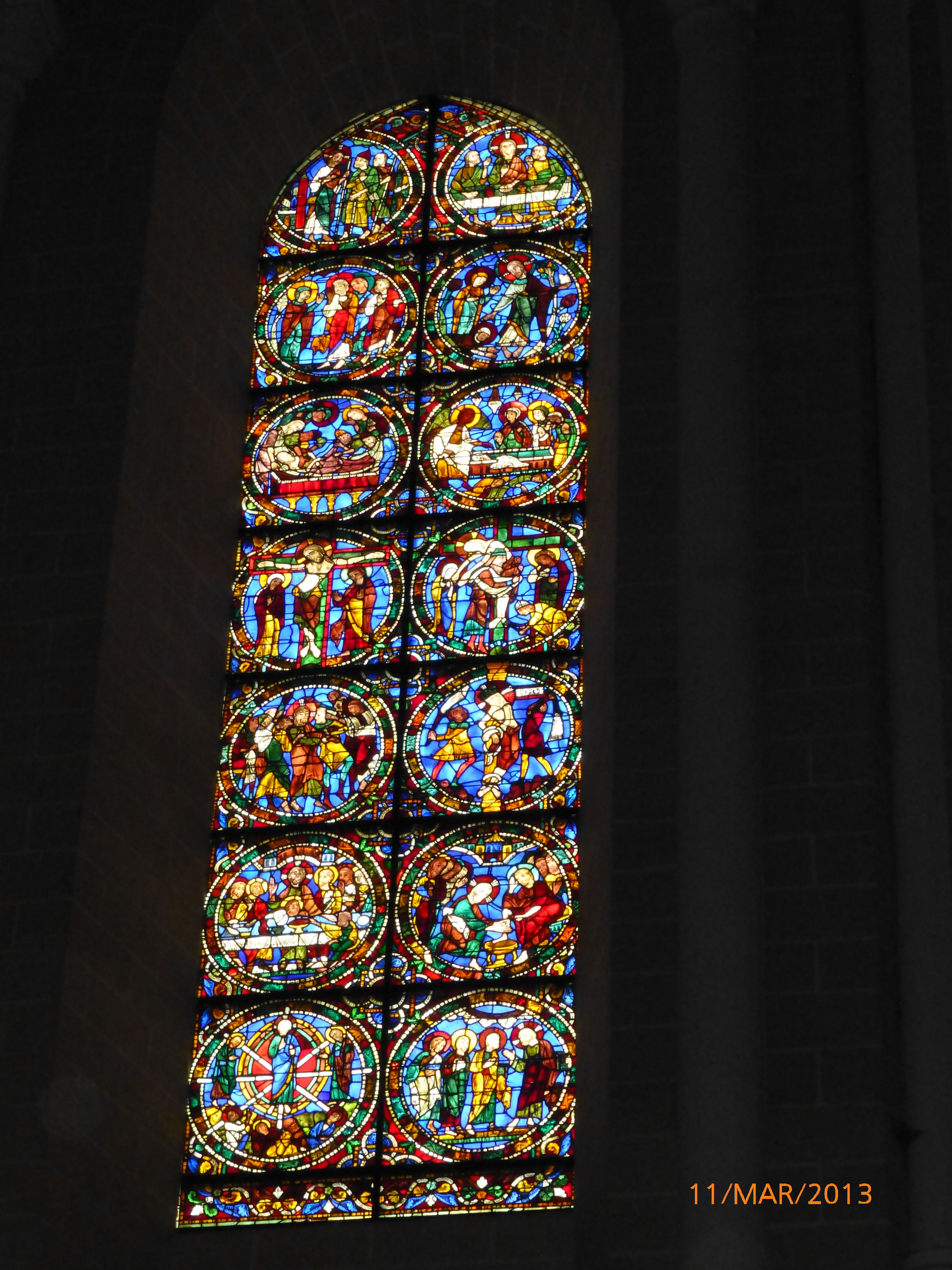 Vitrail de l'église de St-Jean du Béré représentant la donation du monastère de Béré à Albert abbé de Marmoutier, donation faite vers 1050 par Brient et sa mère innoguen.