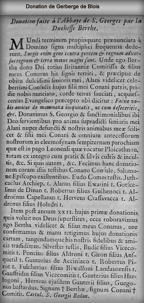 Mundi terminum propinquare praenunciata à Dominio signa multiplici frequentia dederunt Surgit enim gens centra gentem et regnum adversus regnum et terrae motus magni sunt. Unde ego Bertha dono Dei totius et filius meus Conan his signis territi et praecipue de obiti dulcissimi senioris mei, Alain videlicet celeberrimi Consulis hujus filii mei Conani patris ,pridie nobis nunciato corde tenus sauciati ,acquiescentes Evangelico praecepto ubi dicitur ; Facite vobis amicos de mammona iniquitatis ut cum defeceritis Donavimus S.Georgio et sanctimonialibus ibi Deo servientibus pro anima supradicti senioris mei Alani nuper defuncti et nostris animabus mea scilicet et filii mei Conani et omnium antecessorum nostrorum in eleemosynam sempiternam parochiam quae est in pago Leonensi quae vocatur Ploicathnou ,totam ex integro cum pratis et silvis cultis et incultis etc.Si quis autem etc Fecimus hanc donationem coram istis testibus Conano Consule, Salomone Episcopo existentibus . Eudo Comes testi . Juthcaëlus Archiep. et Alanus filius Ewarini et Gotscelinus de Dinan et Robertus filius Guihenoci et Aldroënus Capellanus et Herveus Crassavaca et Aldrenus filius Holedri .Item post annum XXII hujus primae donationis, quia voluit nos Deus superstites ecce roboravimus ego Bertha videlicet et filius meus Conanus, ore confirmamus et manu tetigimus hujus donationis cartam ,tangendam his nostris fidelibus et amicis tradidimus . Silvester testi, Budic filius vicecomitis, Poncius filius Aldroni et Giron filius Ansquetil et Gauterius de Acciniaco et Robertus Pirot et Fulcherius filius Riwalloni Landaurensit et Gauffridus filius Vicecomitis et Gauterius filius Harlogoni, Herveus ejusdem Gauterii filius, Guegonus bastardus. Signum Berthae, signum Conani Comitis. Cartulaire Saint-Georgii Redonis